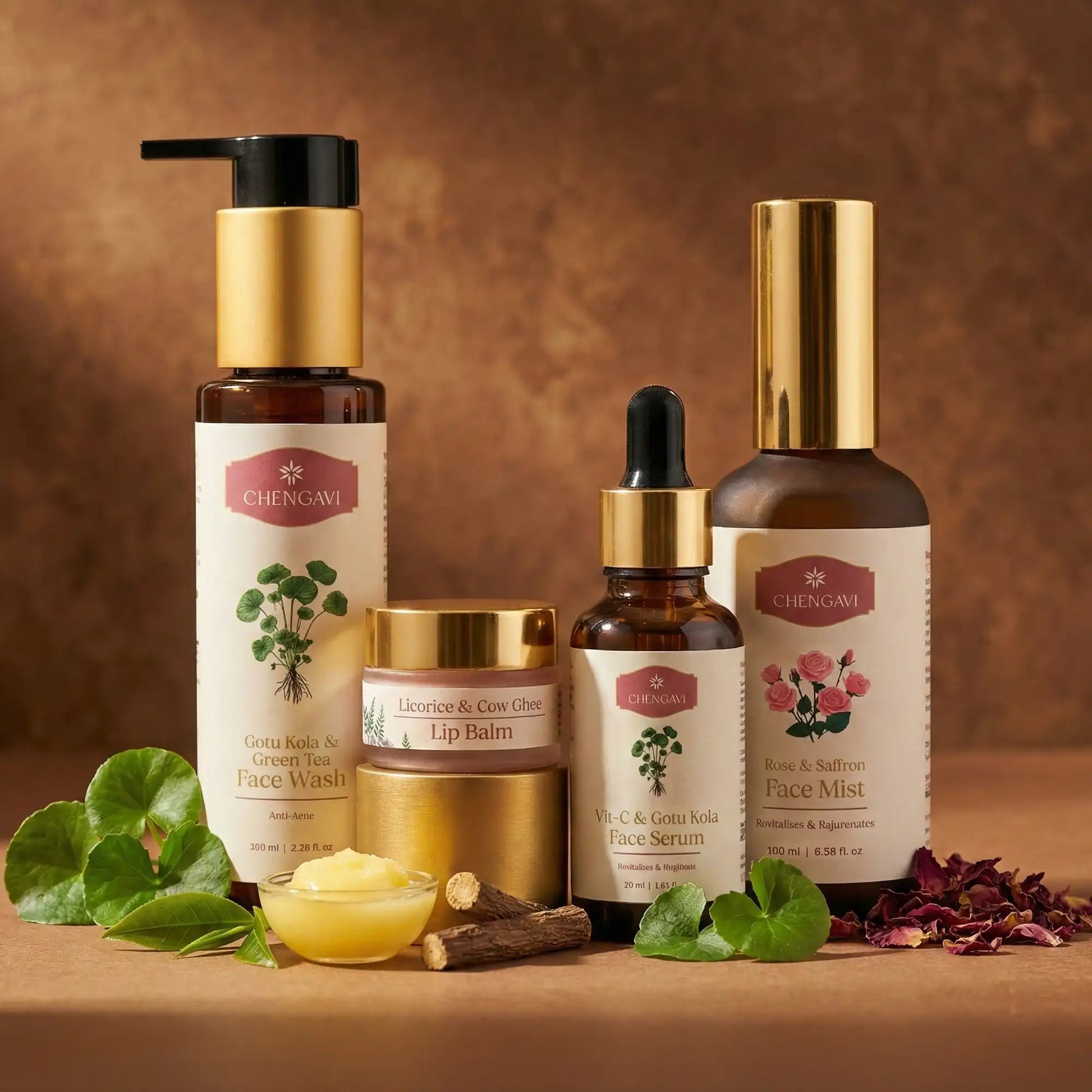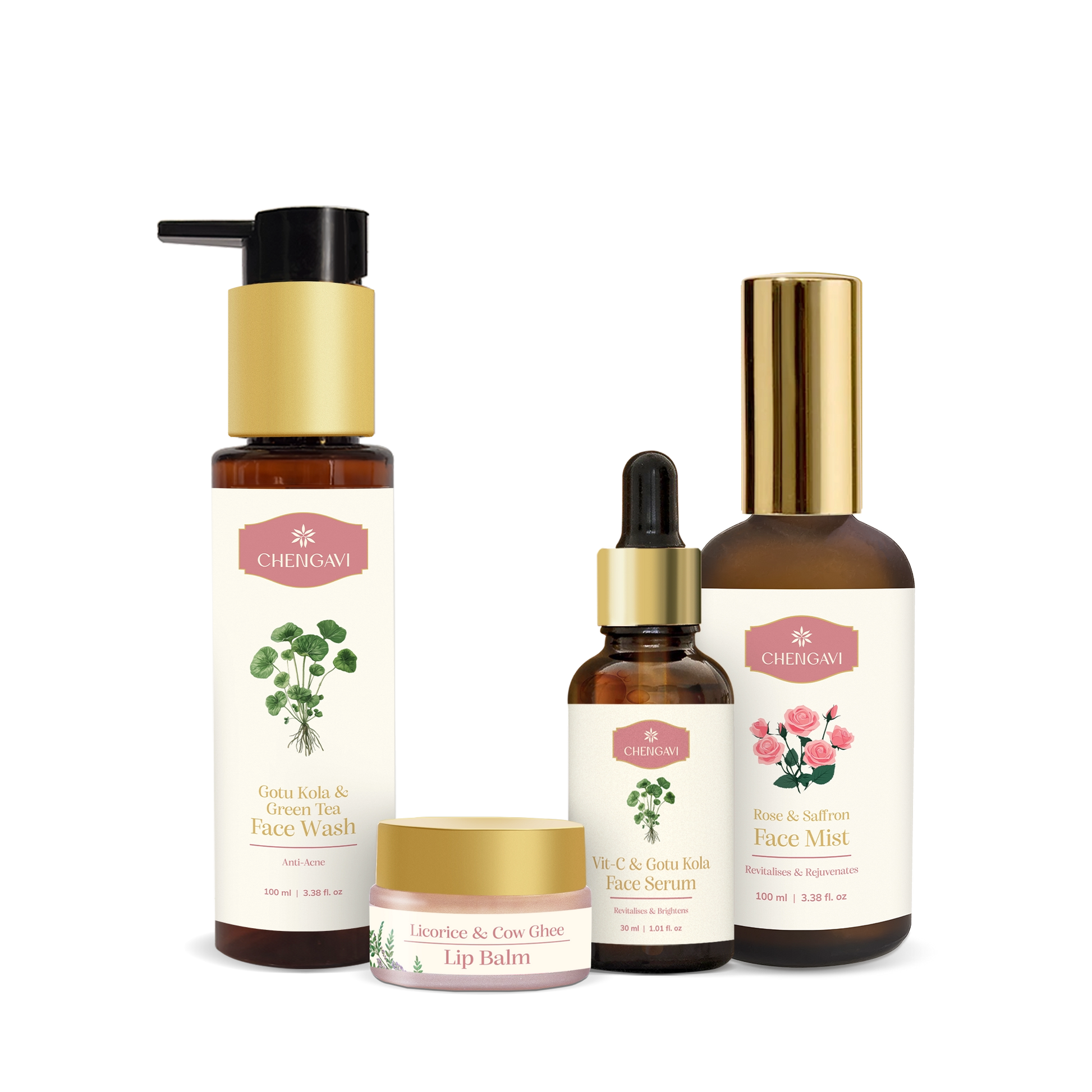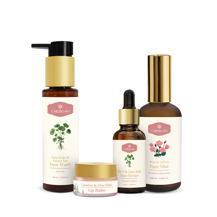 Take the required amount of the facewash on your hand and work gently in a circular motion on your face. Rinse off with water & towel dry. Hold the mist 8-10 inches from face and spray gently to lock in the hydration. Allow the mist to be absorbed by the skin. Apply 3-4 drops of serum to your face and neck, massaging in upward circular motion until absorbed. Complete the ritual with your the lipbalm and you are good to go.