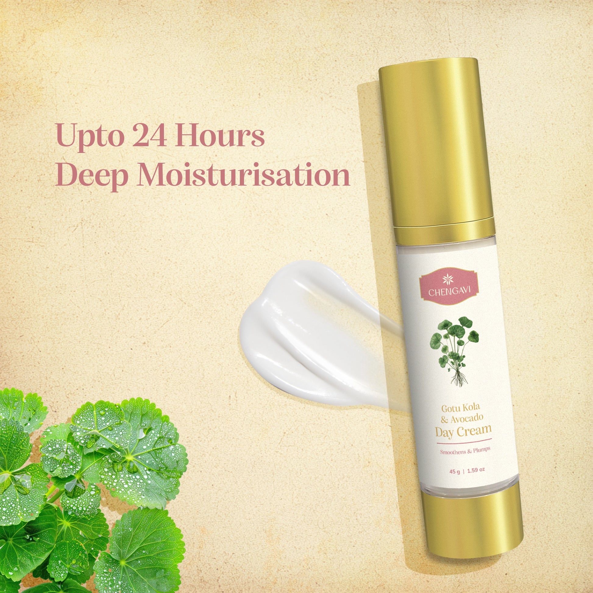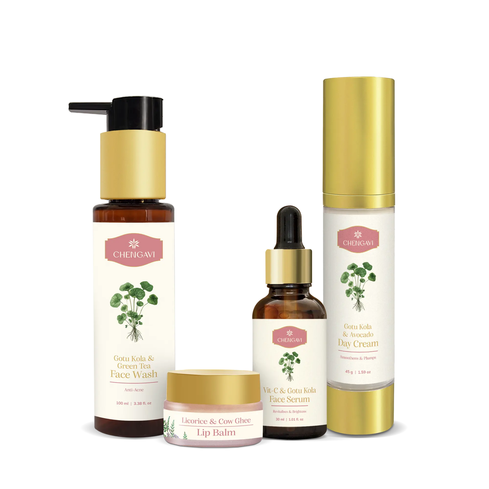 In Ayurveda, Gotu Kola is celebrated as a powerful herb for skin rejuvenation and healing. Its Soma (moon-like) qualities nourish and hydrate the skin, enhancing ojas (vital energy) and promoting a luminous complexion. Known for its tridosha-balancing properties, it soothes pitta dosha, reducing redness and inflammation, while stimulating collagen production to improve skin elasticity. Rich in antioxidants and phytonutrients, it helps repair damaged skin, fade scars, and restore a youthful, firm texture.